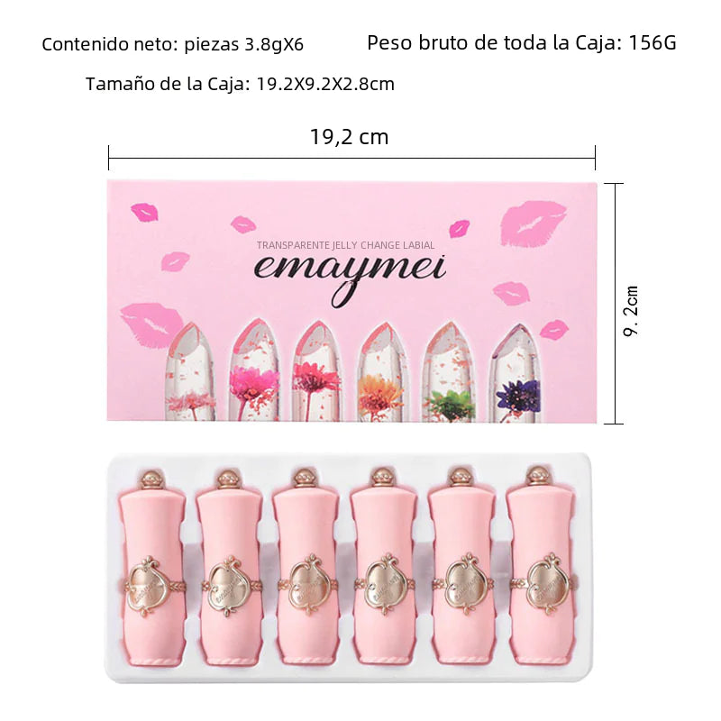 Discover the magic of colour with our Cross-Border Transparent Moisturizing Jelly Flower Temperature-Change Lipstick Set. This exquisite collection features 6 beautifully crafted lipsticks that not only enhance your lips but also change colour based on your body temperature, giving you a unique and personalized look every time you apply them.
